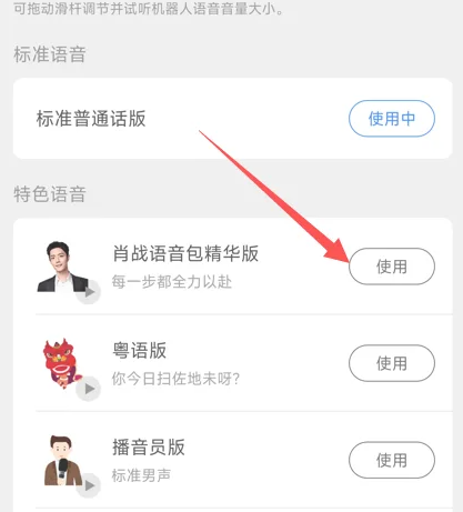 第三步,在语音及音量的设置中选择喜欢的特色语音,然后点击使用