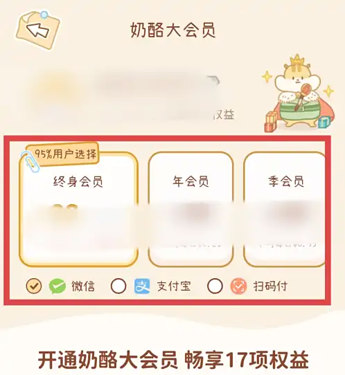 选择会员套餐,并指定支付方式,点击“立即购买”进行付款,会员开通成功。