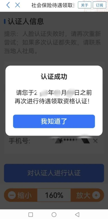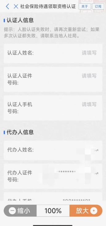 如需为父母及其他待遇领取人员代办认证,选择进入“代他人认证”,填写认证人的姓名、身份证号、认证人或亲属的手机号等信息,点击“对认证人进行认证”,对待遇领取人员进行刷脸认证。认证完成会提示认证成功,并显示下一次的认证截止时间。(需要特别注意的是,此处需对退休人员本人进行刷脸认证)