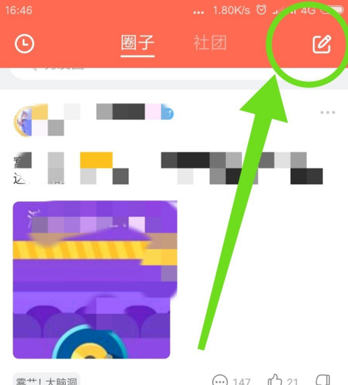 在『圈子』一栏里点击右上角的图标(图标是一支笔底下放着一个本子);