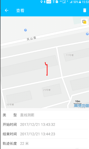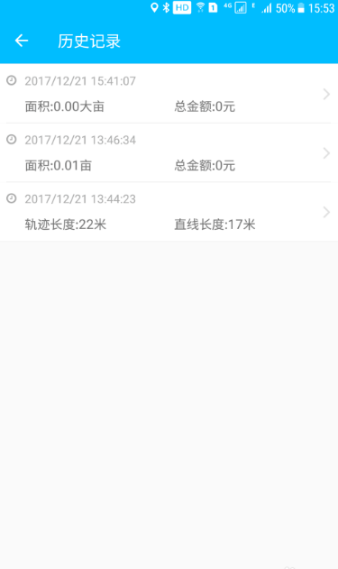 历史记录可以查看之前测量的亩数和长度(包括直线长度和轨迹长度)。