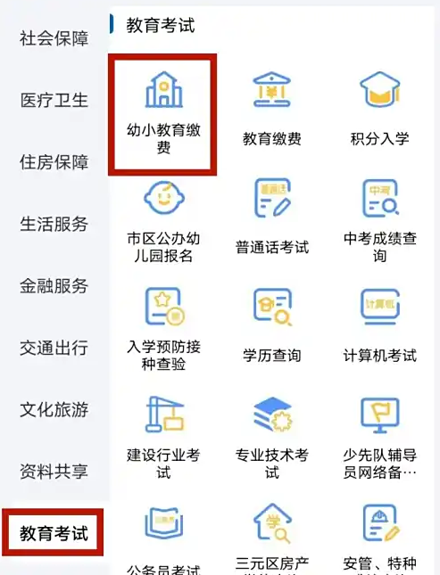 更多页面,点击教育考试分类,选择幼小教育缴费。