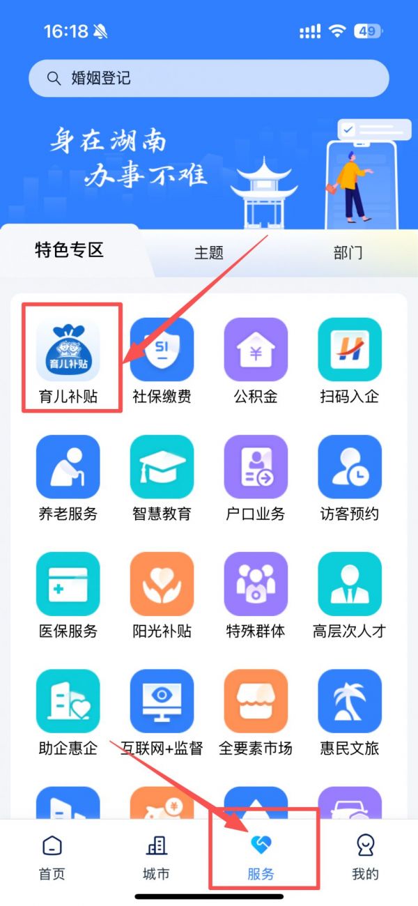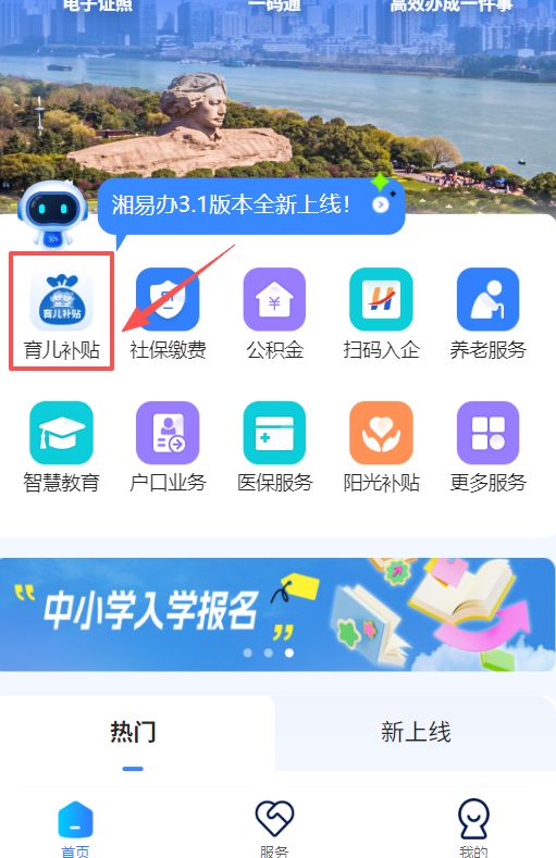 1、打开“湘易办”app或者“湘易办”微信小程序,选择【育儿补贴】专区