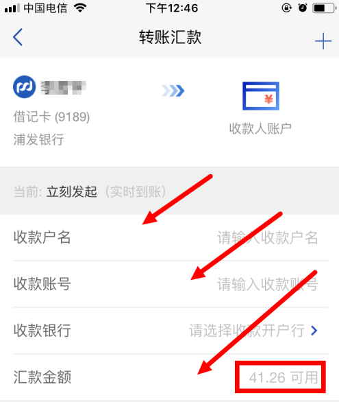 输入 收款户名 、收款账号 后,收款银行会自动显示。汇款金额不可超过 账户可用金额 。