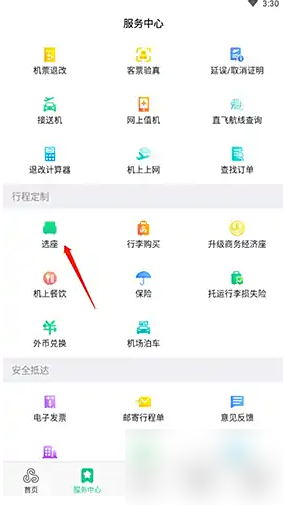 2、进入服务中心页面,点击“选座”。如果你已经购买机票,即可进行选座操作。