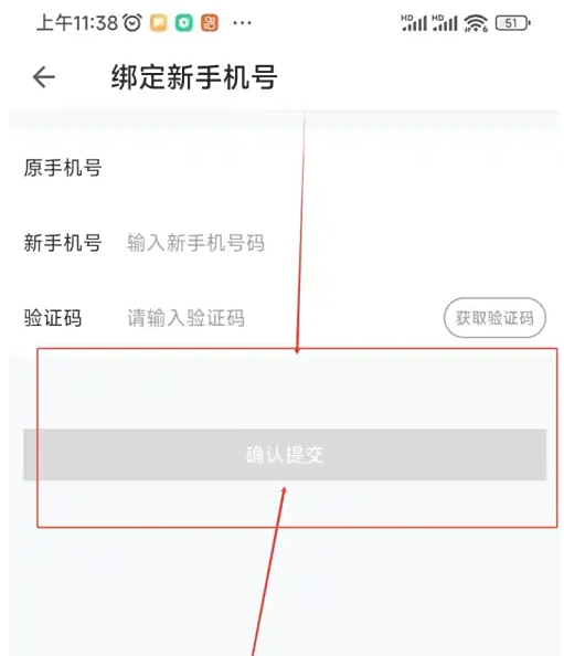 在弹出的新界面中输入新手机号和验证码后,点击“确认提交”,即可完成更换绑定手机号的操作
