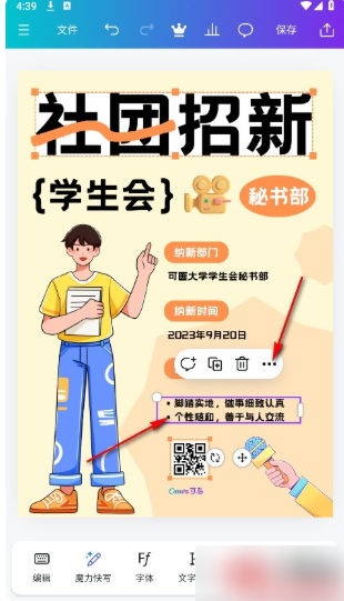 1、第一步,我们在手机上找到Canva可画软件,打开该软件,再在项目页面中打开一个海报项目