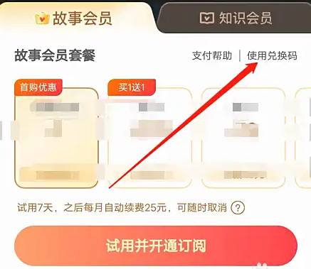 打开安卓版口袋故事的故事会员页面,点击使用兑换码。