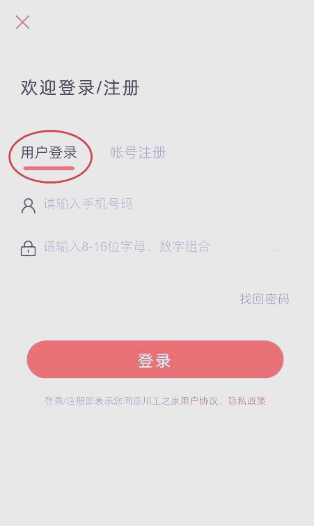 在川工之家app中,完成账号注册后,接下来您需要点击“用户登录”选项,输入您已注册的手机号码及用户密码,以完成登录流程。