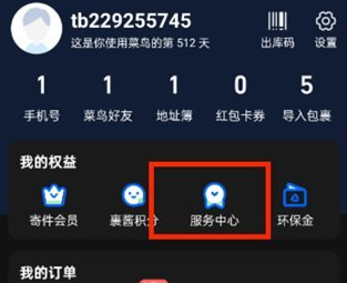 2、然后在我的页面中可以看到有寄件会员、裹酱积分、服务中心、环保金权益,我们需要点击【服务中心】;