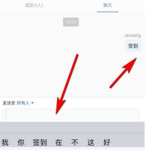 第四步:在聊天页面底部点击输入签到,点击发送,这样就成功在会议房间打卡签到了(如图所示)。