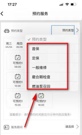 进入到【维保预约】页面,在预约类型这里设置要保养的类型。