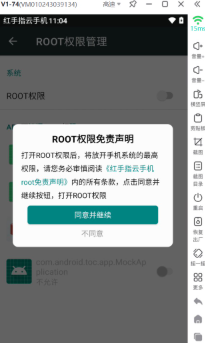 2.第一次开启ROOT权限开关,需要大家点击同意免责《ROOT权限免责声明》,否则无法使用root权限开启云手机的管理员权限。