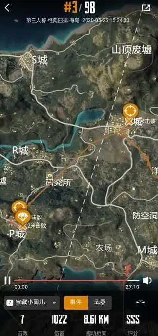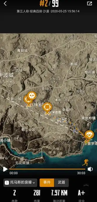 并且在自己被淘汰之后地图上还会出现开枪的声音,而且还有标注。能够准确地看到自己是在什么位置被击倒,在视频播放的时候玩家也可以更具自己的需要调整进度条,查看到一些详细的信息。除了这个玩家还能够通过放大地图,点击地图上的标志查看自己的详细淘汰信息。在信息中也会显示自己淘汰对手的数量和时间还有距离,而标志也会根据自己淘汰对手的数量进行改变。
