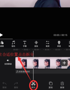 3、滑动下方的视频帧,将竖线对准要删除片段的前后位置点击“拆分”
