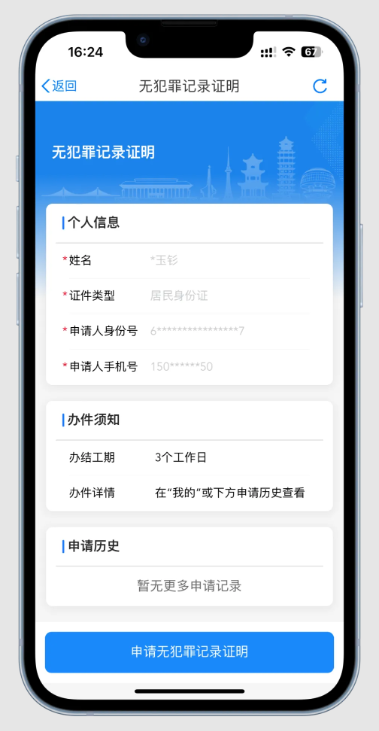 2、查询页面显示用户个人信息,点击下方“申请无犯罪记录证明”并进行人脸识别认证。