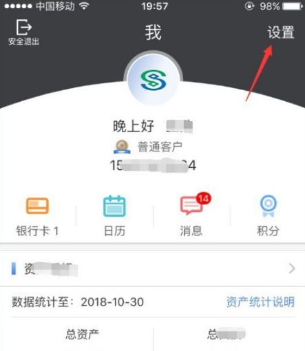 登录成功后,点击首页右下角的“我”,进入民生银行手机银行的个人中心,点击右上角的“设置”,进入手机银行的系统设置,如图所示。