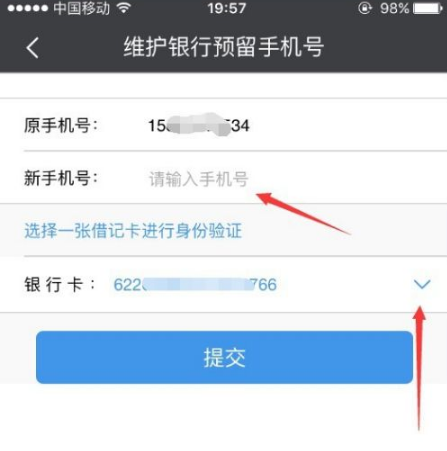 进入手机号编辑之后,就可以输入你的新的手机号了,注意下面要选择一张银行卡进行身份验证,然后点击提交,如图所示。
