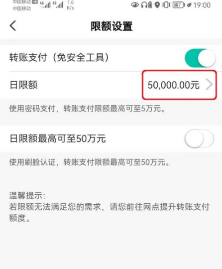 进入限额设置页面,中国农业银行根据认证方式,使用密码支付*高限额5万,使用刷脸认证*高限额50万。根据需要开启相应的认证方式后,点击【日限额】设置。