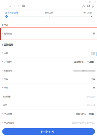 1.选择是否代办,为本人办理参保登记,选择“否”,为亲属办理,选择“是”。