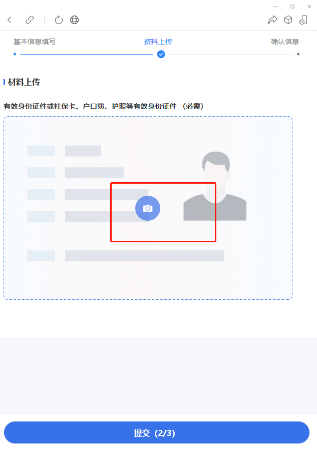 依次点击页面中摄像头图标上传居民户口簿主页、居民身份证或者其他有效证件的影像材料(可选择拍照或者从手机相册图片上传)后提交。