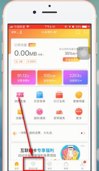 1.首先打开电信营业厅app,点击下方的【查询办理】功能,