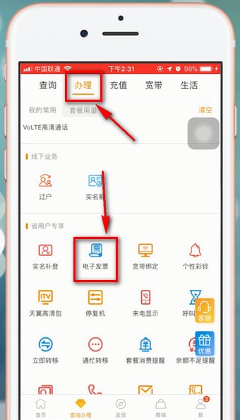 2.然后切换到【办理】页面,选择下方的【电子发票】,
