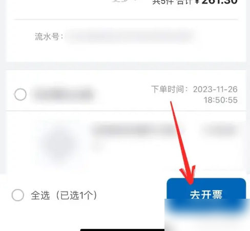选择开发票的订单后点击去开票。