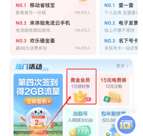 中国移动手机营业厅app怎么成黄金会员 中国移动开通黄金会员方法 作者:张易川 时间:2026-01-05 06:05:13 来源:快云科技网 打开APP首页,点击热门活动 进入热门活动页面,点击黄金会员 打开黄金会员页面,点击1元开通黄金会员 本站所有文章、数据、图片均来自互联网,一切版权均归源网站或源作者所有。 如果侵犯了你的权益请来信告知我们删除。 上一篇:库乐队如何剪辑音乐长短 库乐队剪辑铃声长度方法 下一篇:网易藏宝阁app深色模式怎么关闭 藏宝阁关闭深色模式方法