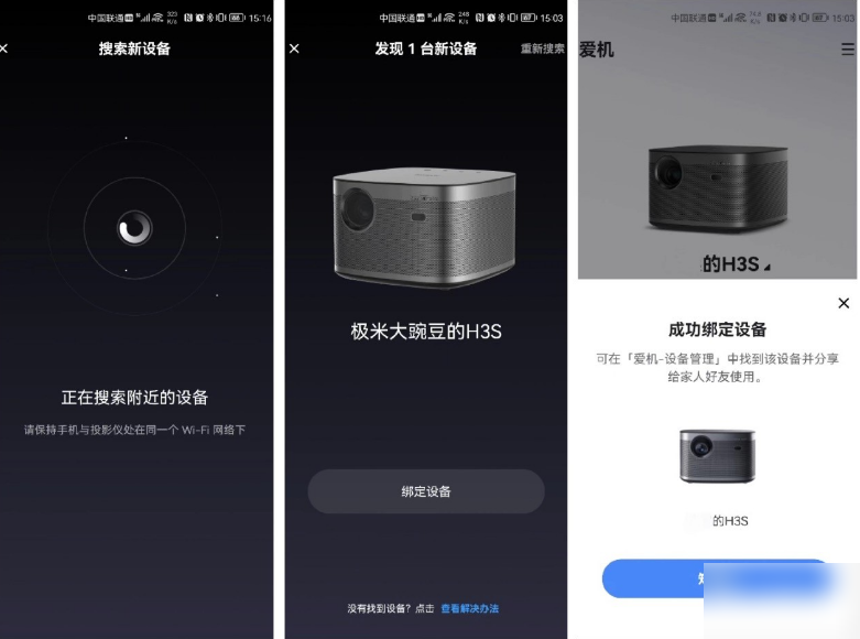 2、进入【添加设备】后画面如下图1所示,等待搜索一般等待5-20秒左右,搜索到设备后,再点击【绑定设备】。接着界面会提示您填写验证码,将极米投影仪画面显示的验证码正确输入,绑定成功。