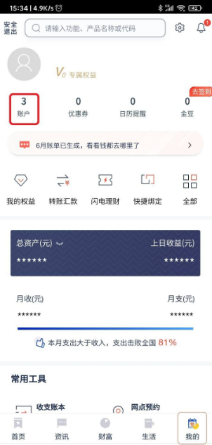 “我的账户总览”界面,点击需要查询的借记卡。
