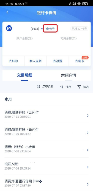 跳转到“银行卡详情”界面,点击“查卡号”字眼。