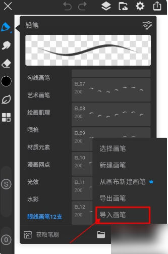 2、选择导入画笔,选择下载的画笔文件即可,自动分类。