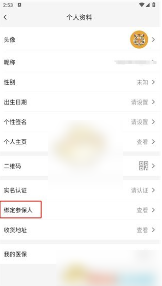 3、接着来到个人资料的页面,在这里点击【绑定参保人】;