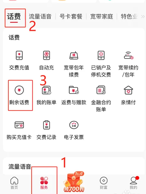 选择【话费】-【剩余话费】;