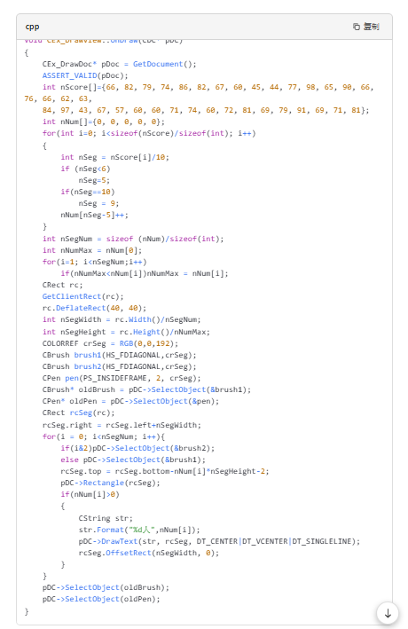 重写OnDraw函数:在视图类中重写OnDraw函数,通过CDC对象的绘图函数进行图形绘制。例如,使用Rectangle函数绘制矩形,Ellipse函数绘制圆形,Polygon函数绘制多边形等。
