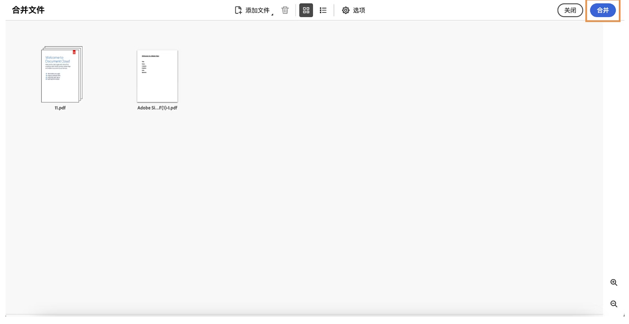 确认后文档列于面板,可拖拽排序,点右上角「合并」即可生成新 PDF 并在 Acrobat 新标签页打开。