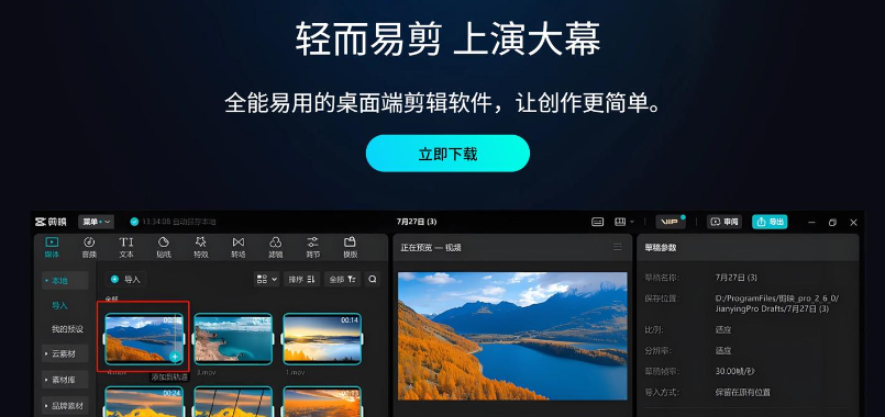 剪映专业版是一款全能免费的桌面剪辑工具,集裁剪、拼接、转场、调色、音频分离等基础功能与智能字幕、关键帧、LUT调色等进阶特性于一体。剪映专业版支持多轨道剪辑、海量素材库一键调用,并可4K硬件加速导出,让新手和达人都能快速完成电影级视频制作。