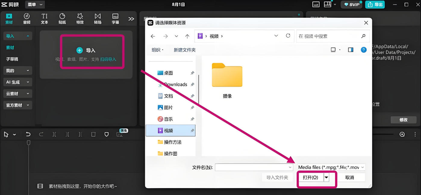点击左上角「导入」→ 选取手机/相机里的 MP4、MOV 等文件