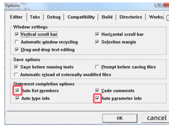 (这里就能看见 3 个复选框:Auto list members / Auto parameter info / Code tool tips,把前两项勾上 → OK)