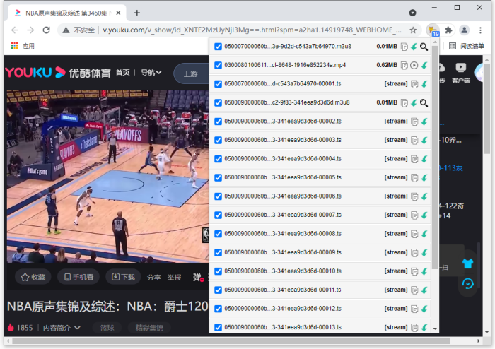 2、小编这里以优酷视频为例,当播放视频时,猫抓插件会自动读取网页中的所有视频源。