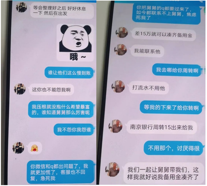 然后就私信聊天,建立感情信任之后,再以“投资内部渠道”“家人急病”等理由诱导转账。