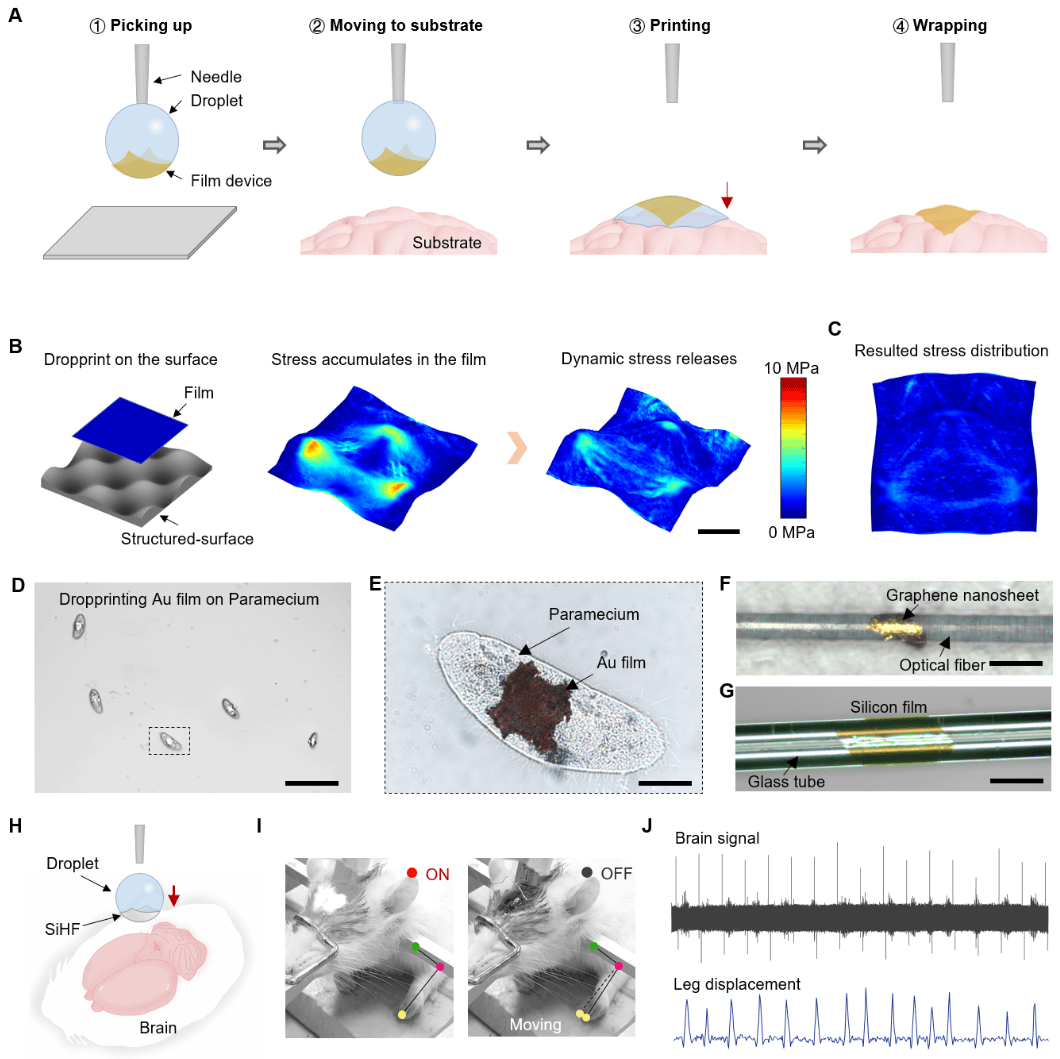 在脑机接口或可穿戴设备的研发中,将厚度仅数百纳米的柔性电子器件贴附于皮肤、神经甚至大脑表面是常见需求。然而,这些器件如同“纸片般脆弱”,在弯曲或拉伸时极易断裂,而人体组织的凹凸结构更让贴合过程难上加难。研究人员打了个比方:“这就像给布满沟回的大脑贴膜,传统方法如同用硬尺压纸,稍有不慎就会撕裂;而液滴打印则像用软毛刷轻抚,既贴合又保护。”