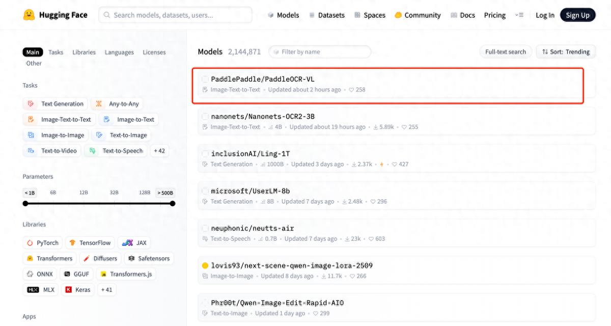 10月17日消息,HuggingFace官网显示,百度昨晚发布的自研多模态文档解析模型PaddleOCR-VL,发布20小时内即登顶HuggingFace Trending全球第一。