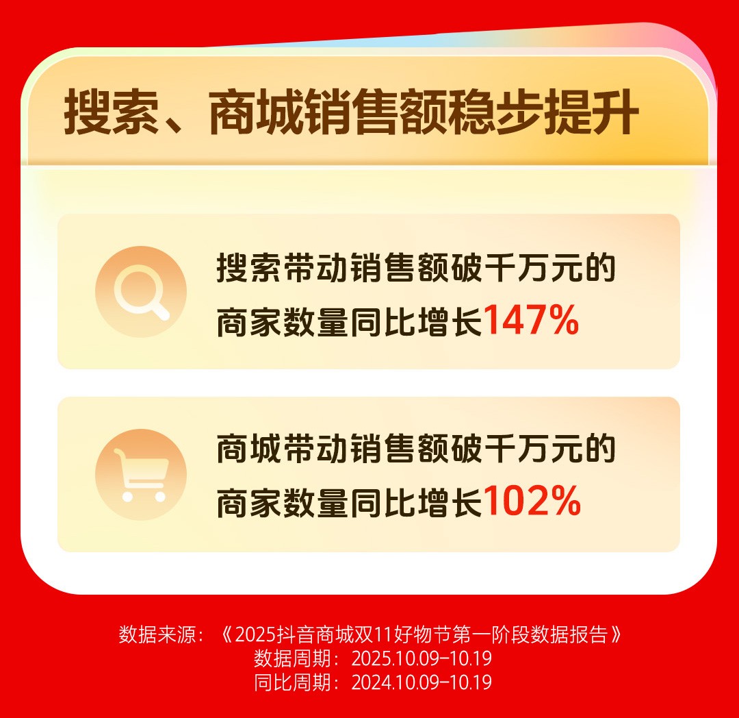 抖音电商货架场景同样表现强劲,是商家长期经营的重要阵地。数据显示,10月9日至10月19日,搜索和商城表现突出,搜索带动销售额破千万元的商家数量同比增长147%,商城带动销售额破千万元的商家数量同比增长102%。
