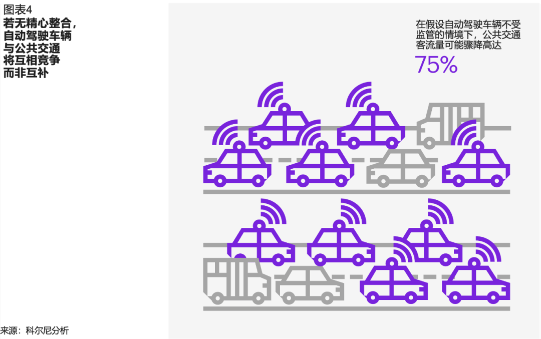 最后,公共交通面临被蚕食的风险。自动驾驶出租车若未与公共交通深度整合,可能成为竞争对手而非补充。无缝衔接的自动驾驶服务可能吸引乘客放弃公交换乘,导致公共交通客流下降、资金减少、服务恶化。综合模型预测,在无监管情景下,公共交通客流量可能骤降75%。现实中,Uber和Lyft进入城市市场后,公交使用量每年下降约1.7%,铁路下降1.3%,这一趋势可能因自动驾驶的普及而加剧。