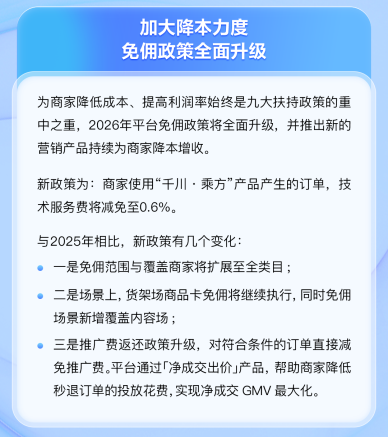 扶持方案聚焦于降低商家经营成本,2026年平台对免佣政策进行升级。商家使用“千川·乘方”产品产生的订单,技术服务费将减免至0.6%。免佣范围在原有基础上扩展至全类目,适用场景由货架场商品卡进一步覆盖至内容场。同时,平台对推广费返还政策进行优化,对符合条件的订单直接减免推广费,并通过“净成交出价”等产品,降低秒退订单等无效投放带来的成本损耗,以提升投入产出效率。